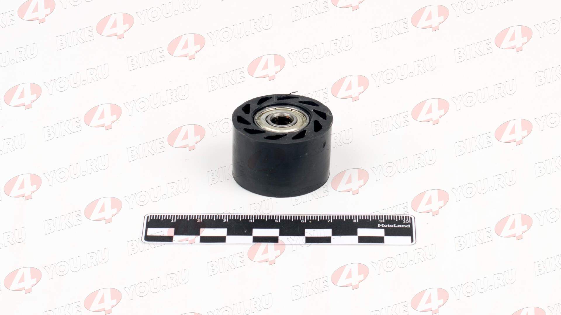 Ролик натяжения цепи, предназначенный для использования в мотоциклах, питбайках или квадроциклах. Это деталь цилиндрической формы с гладкой поверхностью. В центре расположен металлический подшипник, обеспечивающий плавное вращение и минимальное трение. Все размеры указаны на фото